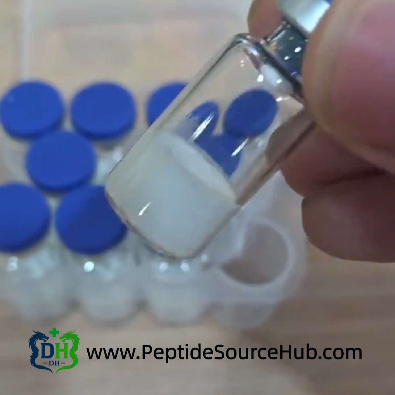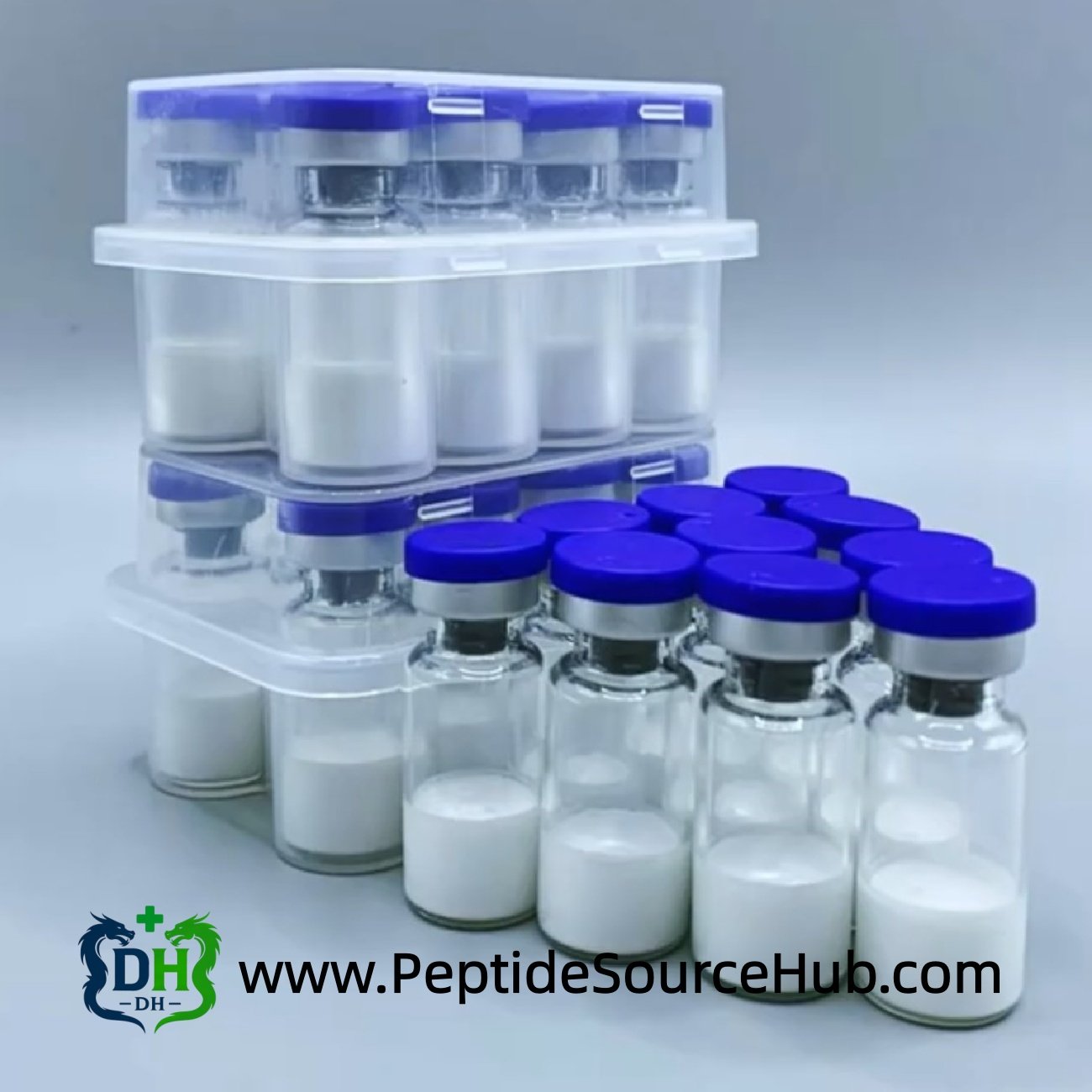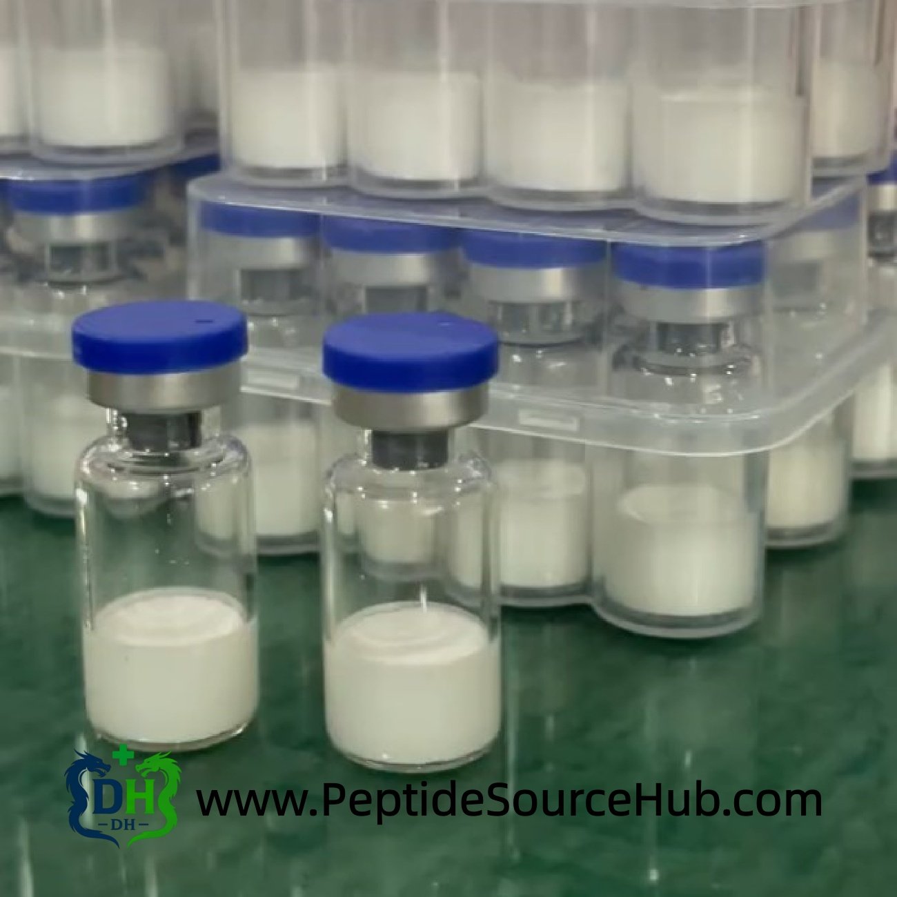 - Standard format: blue-top glass vials with white lyophilized peptide powder
